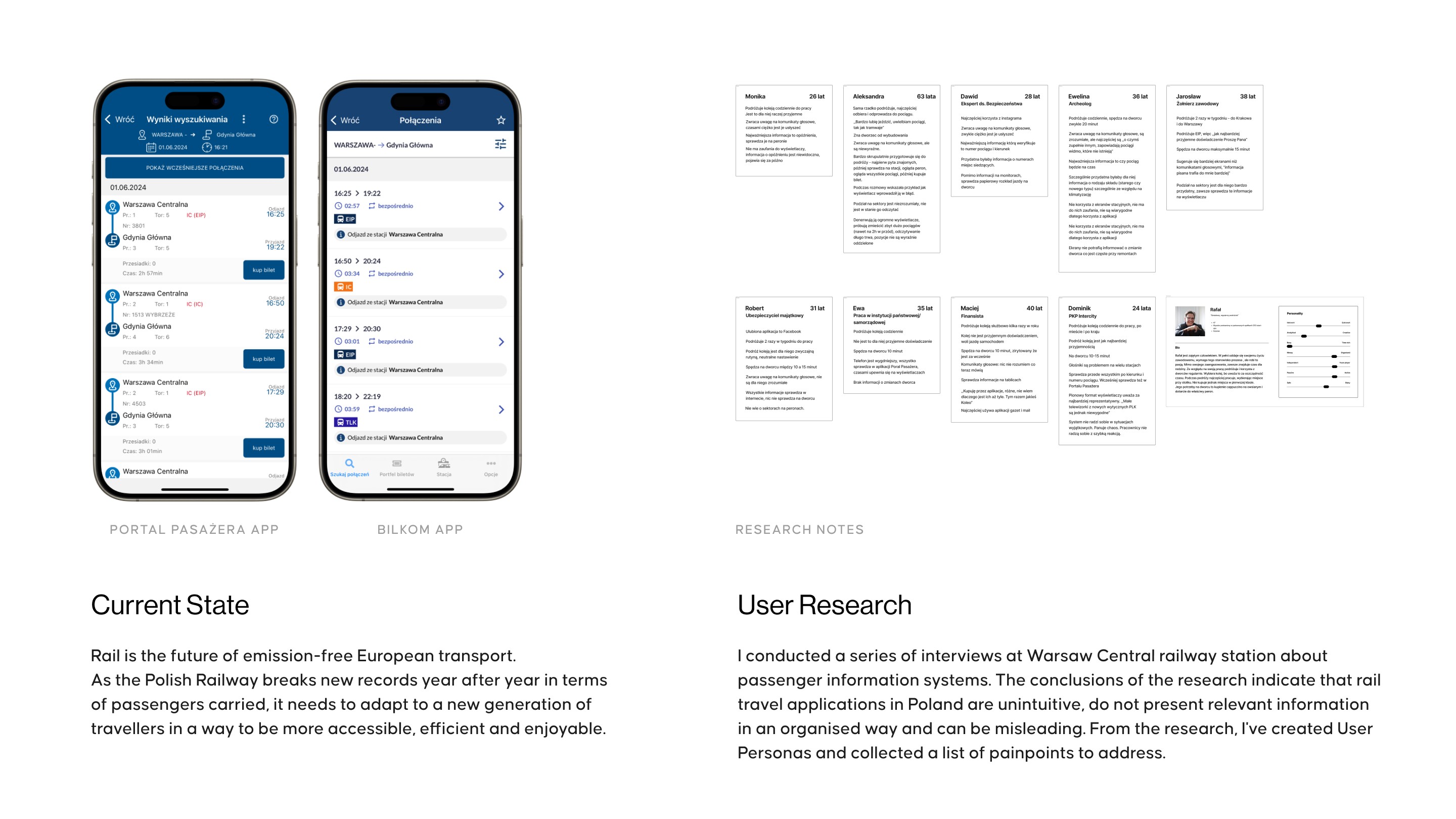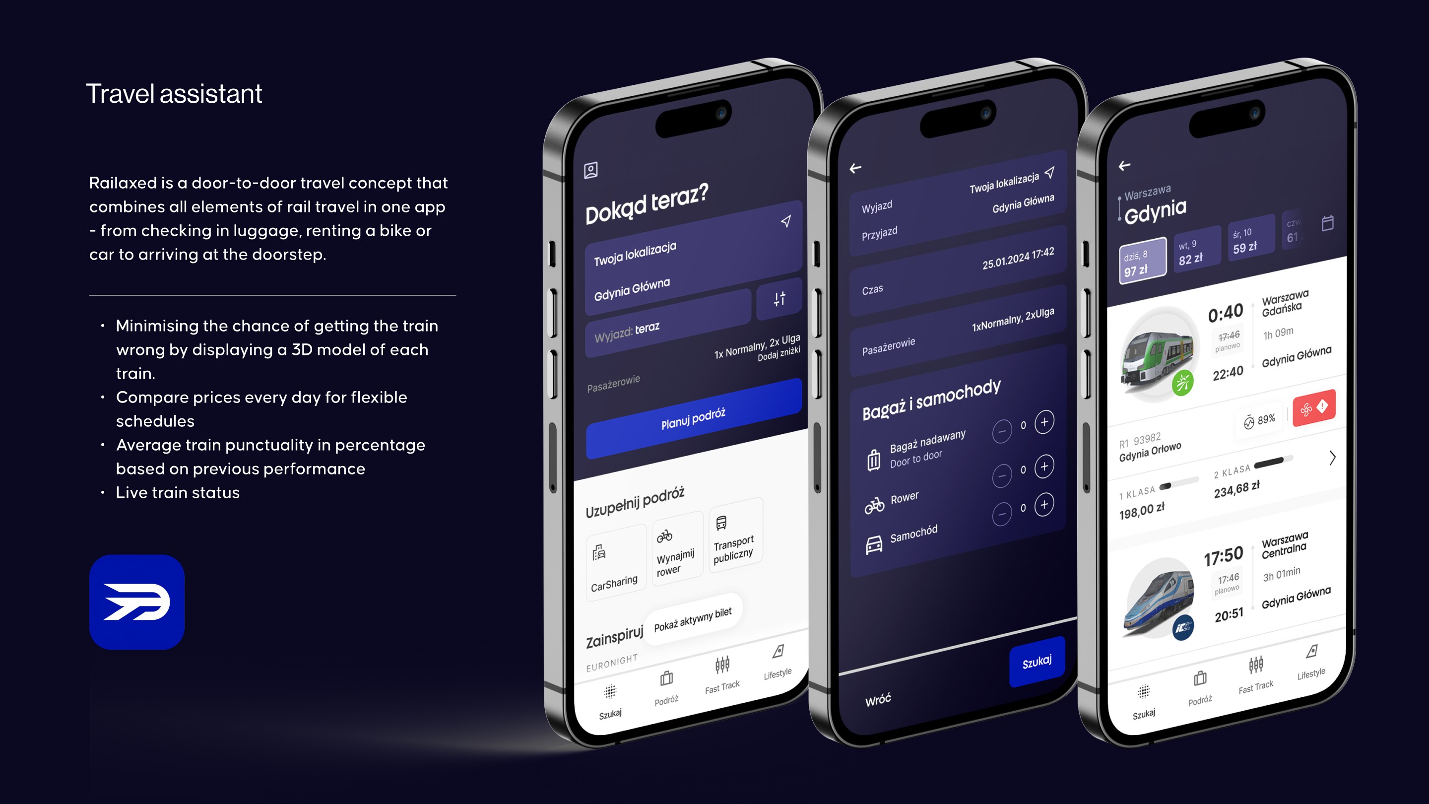 Railaxed is a concept app designed to support the rapid development of Polish railways and meet the evolving needs of new passenger groups. Based on in-depth research and interviews conducted at Warsaw Central Station, the app addresses common travel anxieties through intuitive features such as realistic 3D train models, real-time punctuality updates, and door-to-door baggage service. I designed UX/UI and branding, focusing on clarity, accessibility, and peace of mind—making travel smoother before, during, and after the journey. This project allowed me to explore the full arc of the passenger experience, from the initial idea of a trip to the memory it leaves behind.